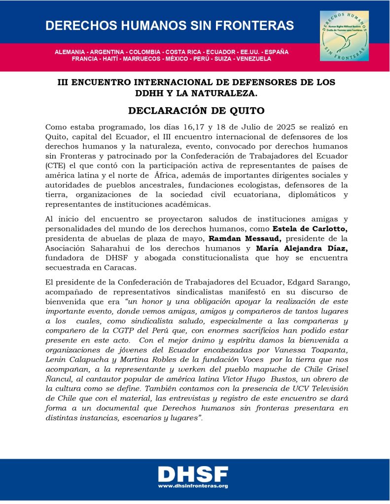 III Encuentro Internacional de Defensores de los DDHH y la Naturaleza: Declaración de Quito