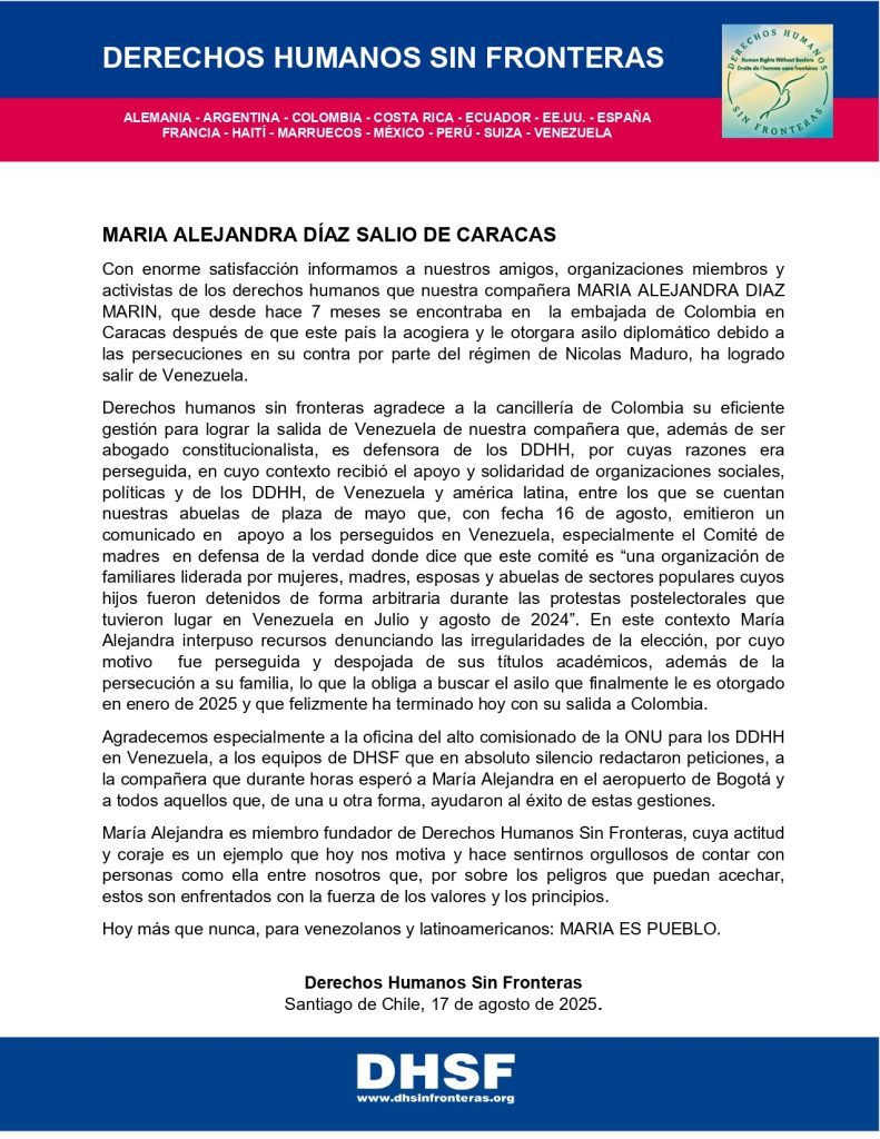 CARTA DE DHSF A CANCILLER DE COLOMBIA POR SALVOCONDUCTO PARA MARÍA ALEJANDRA DÍAZ, ASILADA EN CARACAS.