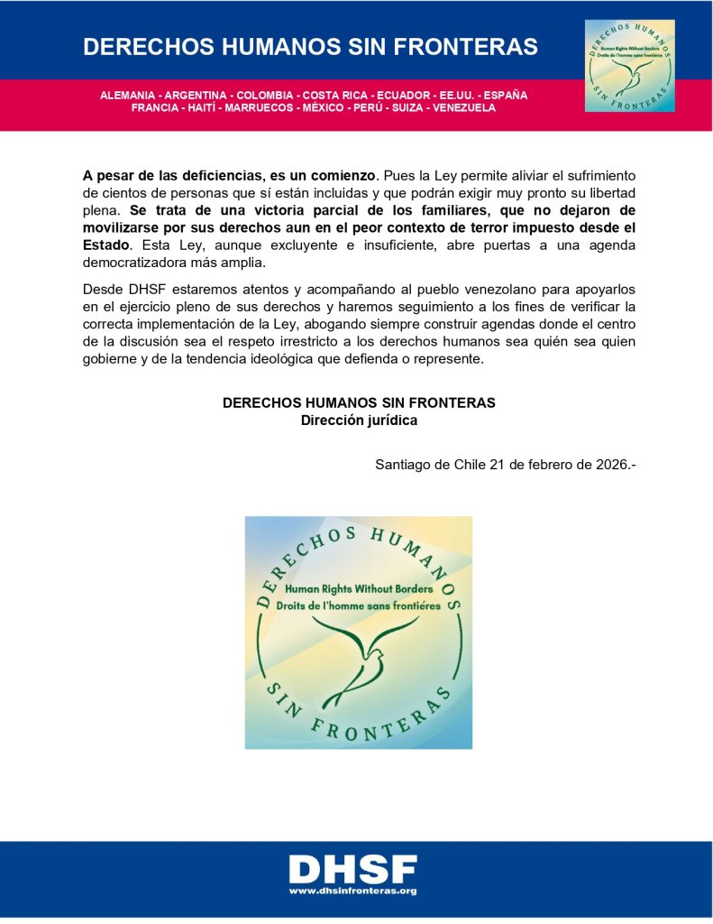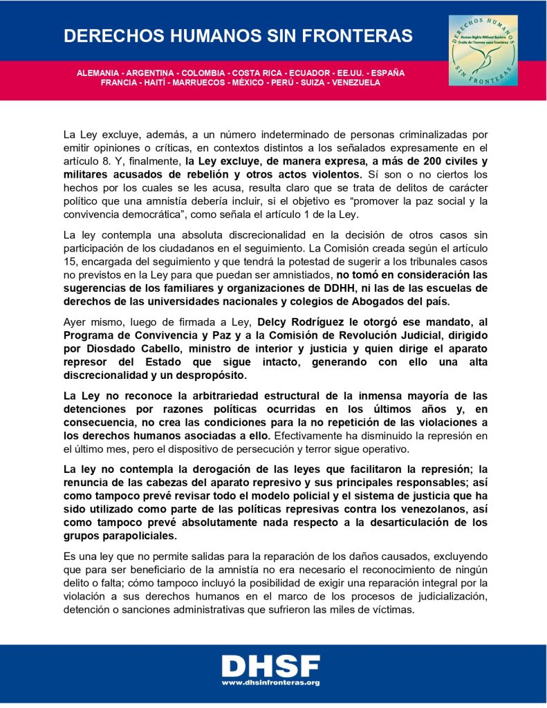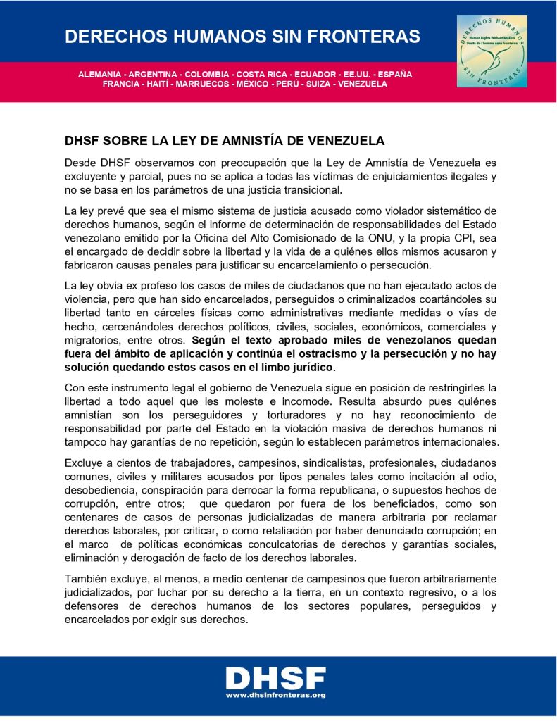 DHSF sobre la ley de amnistía en Venezuela